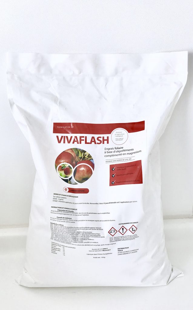 Une nouvelle solution pour valoriser votre production de pommes arrive sur le marché. Il s’agit de Vivaflash, un engrais foliaire WP, à base d’oligo éléments. Il améliore la coloration et l’effet de blush sur les pommes. Ainsi, vous récoltez un plus grand tonnage de pommes colorées et blushées. De plus, les pommes sont colorées plus tôt ce qui diminue le nombre de cueilles.